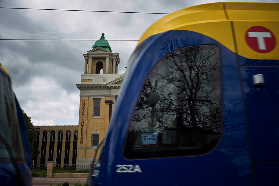 一輛輕軌列車駛過明尼阿波利斯的一所信義會教堂。這條新開通的綠色通道連通了圣保羅和明尼阿波利斯這對雙子城,列車沿途穿越了多個族群的聚居區——曾經,這些區域被來自斯堪的納維亞和中歐的移民把持,而現在則有來自索馬里、老撾、墨西哥等族裔的家庭在此定居。