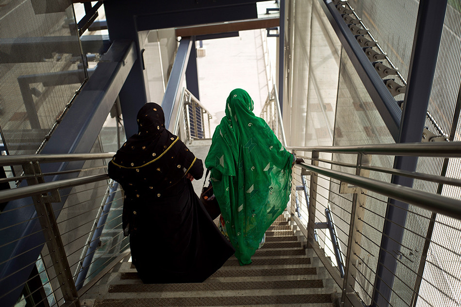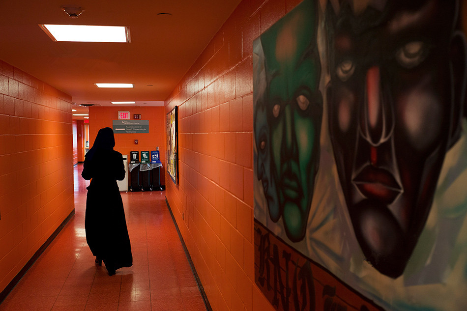 在居住著諸多東非移民的公寓大樓河畔廣場附近,一名來自艾薩俄比亞的婦女(左)和一名來自索馬里的婦女進入明尼阿波利斯的輕軌站。美國種族比例的變化和非白人人口的增長,除了引發某種文化結構的擔憂外,甚至復蘇了白人種族主義,乃至出現了排斥其他種族和民族的行為和政策。