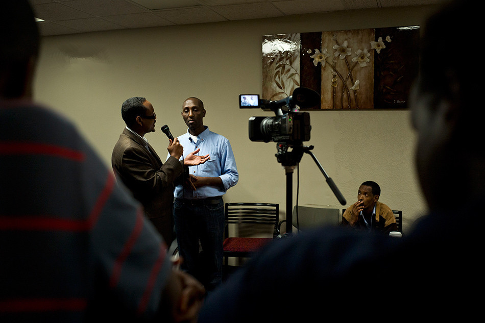 東非移民Mohamud Noor在明尼阿波利斯接受了為本地索馬里裔居民服務的電視臺的一次采訪。Noor是在這一美國中西部州正茁壯成長的索馬里社區的領頭人,他正試圖成為第一位在明尼蘇達州立法機關任職的東非移民。