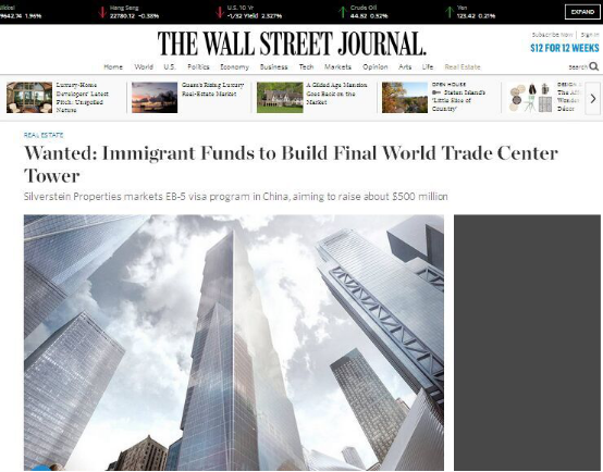 新聞來源(華爾街日報):http://www.wsj.com/articles/wanted-immigrant-funds-to-build-final-world-trade-center-tower-1446569760