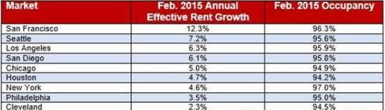 1. 在2015年2月,美國全國有效出租率增長了5.05%,是自2011年7月以來的最高值;