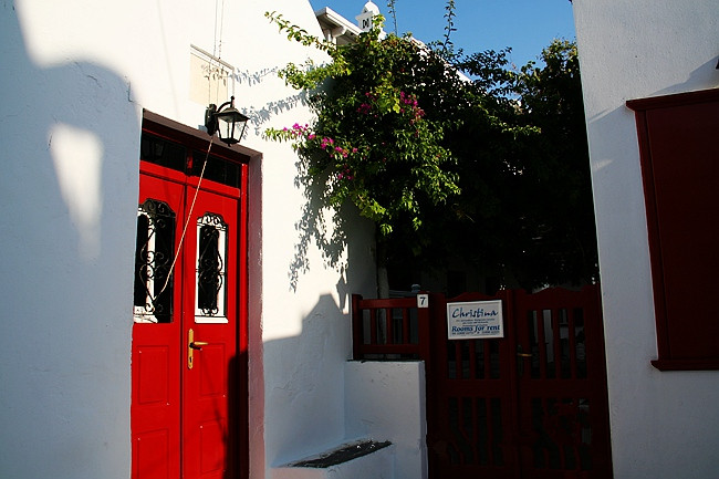 美麗的白色石頭小路,迷宮一般復(fù)雜的小徑,雪白動(dòng)人的盒形屋宇和門窗上鮮艷的藍(lán)、綠、紅等燦爛繽紛的色調(diào),在藍(lán)天大海的襯托下,構(gòu)成了米諾克斯別樣的風(fēng)情。