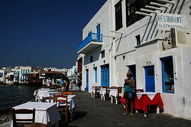 小鎮(zhèn)的盡頭,有一處被稱為“小威尼斯”的地方,是島上最美麗的角落。一幢幢白色的小屋和樓臺(tái)就建在波濤洶涌的海邊,這里餐廳、酒吧林立,極富有威尼斯情調(diào),是觀賞米島日落的最佳地點(diǎn),也是游客最多的地方。