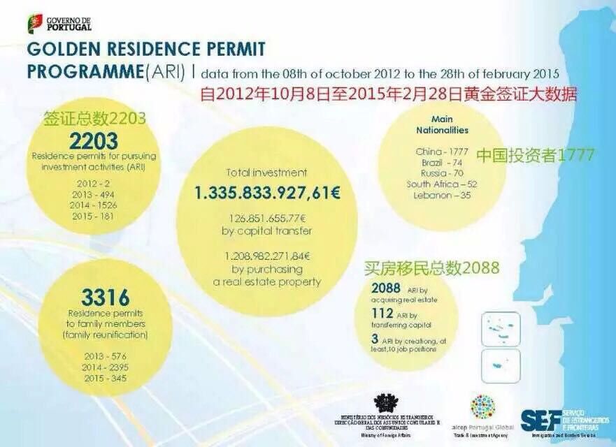 葡萄牙移民局發(fā)布了截止到2015年2月28日最新的官方數(shù)據(jù),自2012年10月8日開始實施“黃金居留許可計劃”以來,累計成功獲得葡萄牙黃金簽證的人數(shù)已達到2203個,投資總金額已超過13.3億歐元。其中,通過購置房產(chǎn)獲得身份的人數(shù)為2088個(約占總?cè)藬?shù)的95%),投資金額約為12億歐元。主要購房人群來自中國,共計1777個。通過申請家庭團聚獲得居留卡的人數(shù)為3316個。