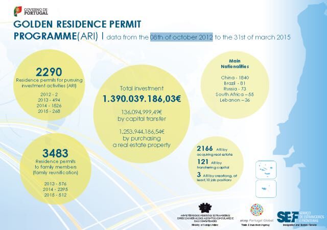 近日,葡萄牙移民局發布了截止到2015年3月31日最新的官方數據,自2012年10月8日開始實施“黃金居留許可計劃”以來,累計成功獲得葡萄牙黃金簽證的人數已達到2290個,投資總金額已超過13.9億歐元。其中,通過購置房產獲得身份的人數為2166個(約占總人數的95%),投資金額約為12.5億歐元。主要購房人群來自中國,共計1840個。通過申請家庭團聚獲得居留卡的人數為3483個。