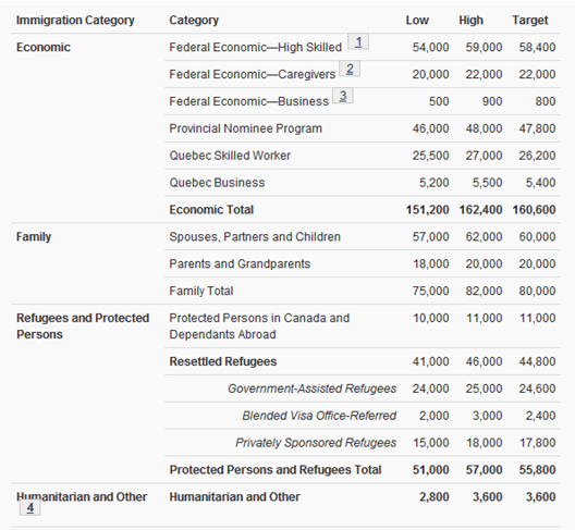 新的年度移民計劃大體將移民類別分為四類。根據計劃,屬于經濟類別的移民目標總數為160,600,家庭類別為80,000,難民類別為55,800,人道主義類別為3,600。