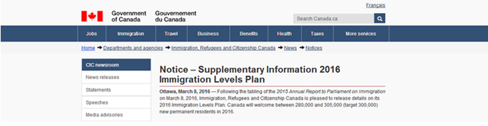 2016年3月8日,加拿大聯邦移民部長麥家廉(John McCallum)宣布,加拿大2016年計劃接受28萬至30.5萬移民,這個配額創歷史新高。