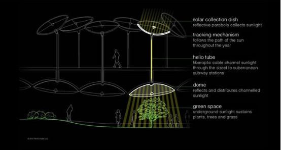 項目使用的,是詹姆斯發(fā)明的一項叫“遠程天窗”的技術(shù)。他們要在德蘭西街的地面上,立起很多像向日葵一樣的電子設(shè)施,用凹面鏡迎著太陽的方向走,把陽光集中收起來。之后,這些陽光通過光纖電纜輸送到地下,過濾掉有害的紫外線和過度的熱量,只保留光合作用需要的波長,滿足地下植物的生長需要,同時保證空氣流通差的地下空間里,溫度不會過高。