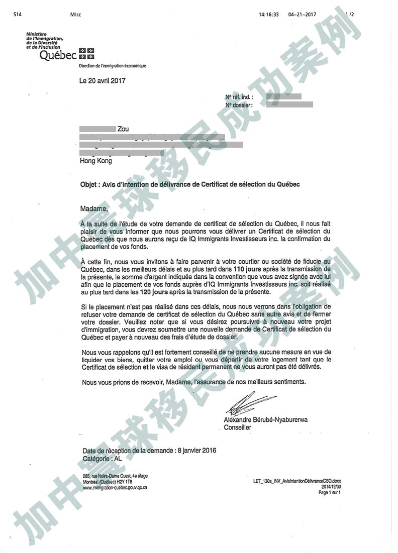 2017年4月20日,加拿大移民魁省項目,鄒女士獲免面試打款信
