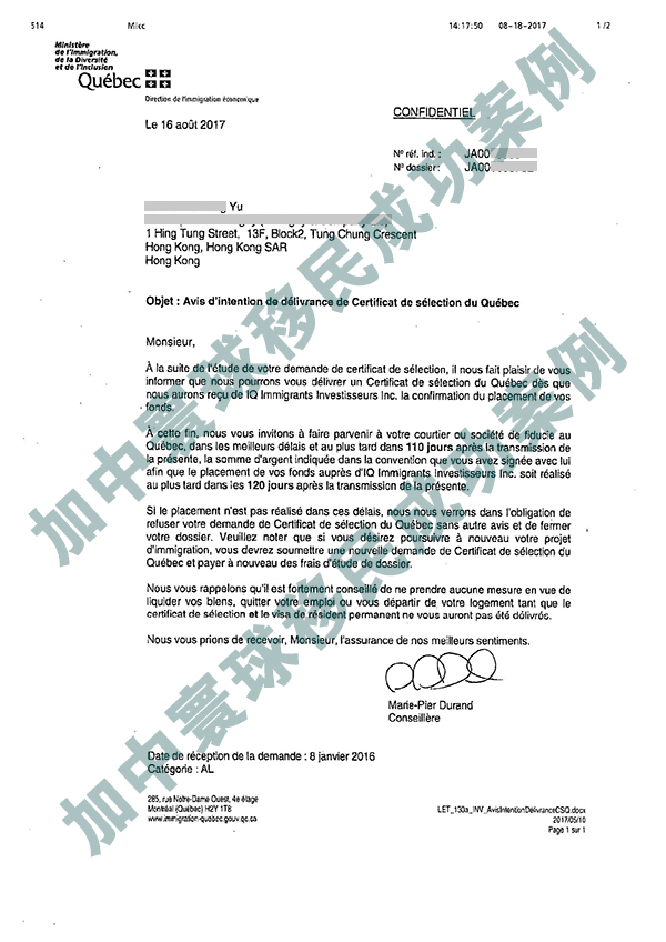 2017年8月18日,加拿大移民魁省項目,于先生免面試通過打款
