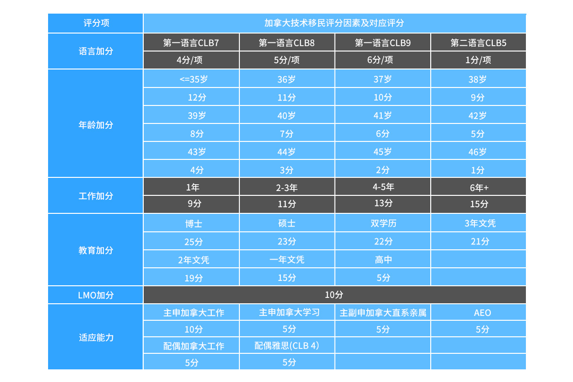EE評分系統 CRS(Comprehensive Ranking System),滿分1200分,主要涉及4個方面: |
