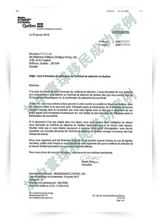 加中寰球憑借23年積累的加拿大移民代理經驗、專業的項目策劃和精深的文案制作以及完善的客戶服務,在跨入2018年之初,薩省、魁投等項目四處開花,今天一天有五位客戶的好消息: 于先生——全家收到簽證(薩省投資移民項目) 2015年4月20日,通過薩省EOI篩選; 2016年9月1日,收到薩省CSQ; 2017年1月23日,轉聯邦; 2017年3月17日,建檔; 2017年6月13日,收到體檢通知; 2018年1月23日,全家收到移民簽證。 于先生的移民過程在薩省提名階段一帆風順,但在轉聯邦過程出現了一點小小波折。在辦理移民申請的過程中,于先生在國內新開了一家企業,個人名下資產出現較大變動,而于先生并沒有及時與加中寰球的文案溝通這一重要信息,因此被聯邦移民局意向性拒簽,加中寰球及時幫助于先生補交了相應材料。加中寰球在此也鄭重提醒所有客戶:在移民過程中,凡涉及客戶申請人、家庭、婚姻方面的任何重大變化,都要及時告知加中寰球,讓加中寰球的移民專家根據實際情況準備相應的申請材料。 以下為掃描件(部分個人信息已做遮擋處理)