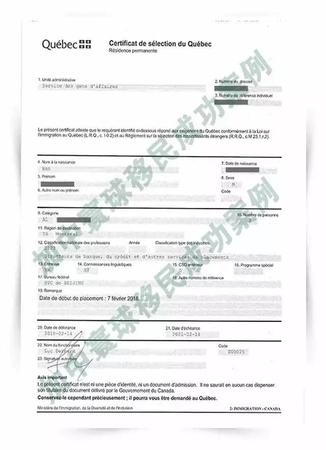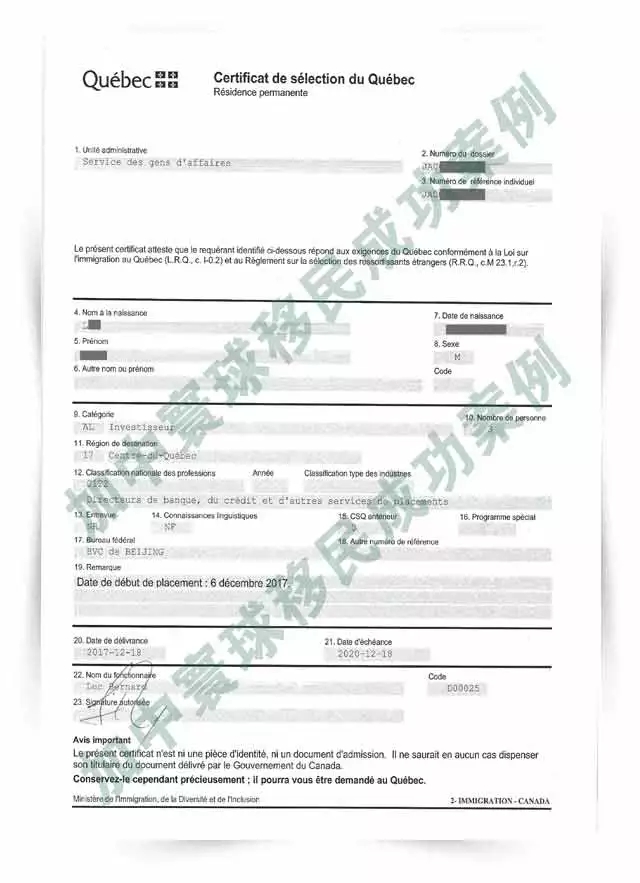 L先生 收到CSQ(魁北克投資移民項目)