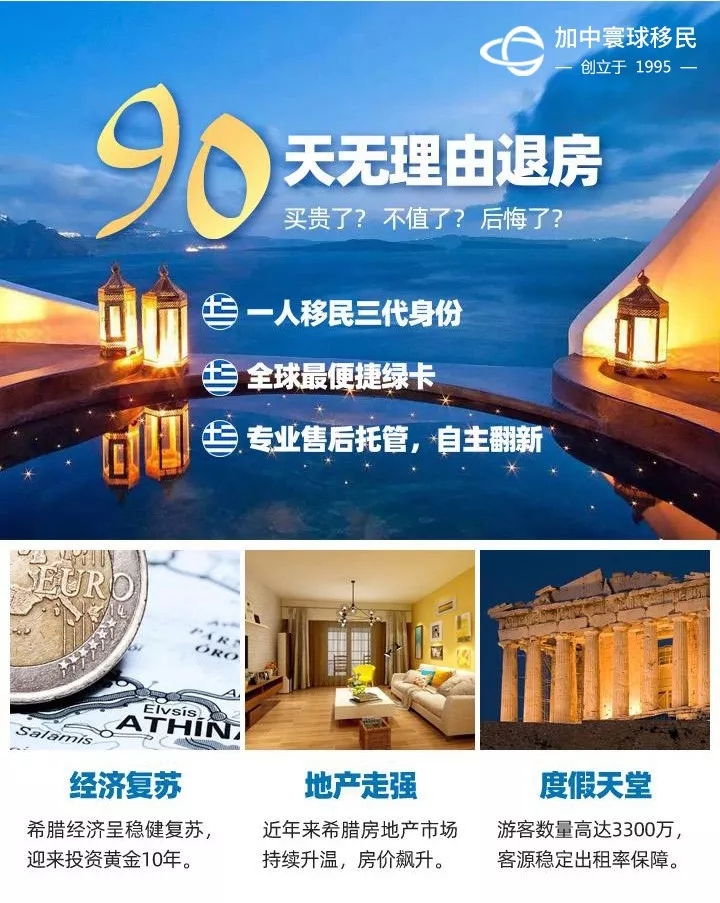 近期,加中寰球攜手希臘金牌開發(fā)商,重新定義希臘購房移民末實(shí)現(xiàn),推出希臘購房90天無理由退房促銷活動,徹底解除投資人的一切顧慮!