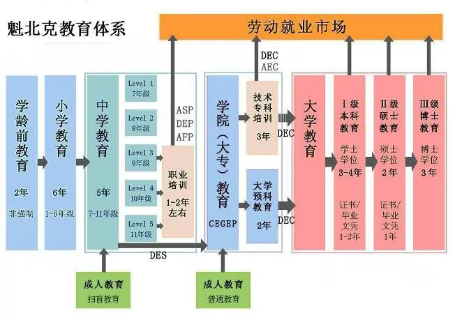 魁北克是加拿大面積最大的省,也是唯一一個(gè)有法語交流語言的地區(qū)。由于受到英法文化交融的影響,該省的學(xué)制與加國其他省份的設(shè)置不同。