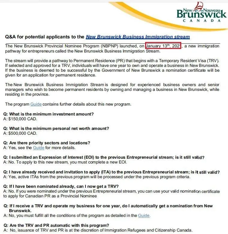 目前,關于該項目的舊政介紹,其官網頁面已經關閉,新政的具體細節和指南尚未出臺,NB省移民局只在其官網給我們提供了一份潛在申請人的問與答,算是對所有關心該項的申請人以及潛在申請人的一個交代。下面我們就來看看“新不倫瑞克省企業家移民項目潛在申請人問與答”的有關內容: