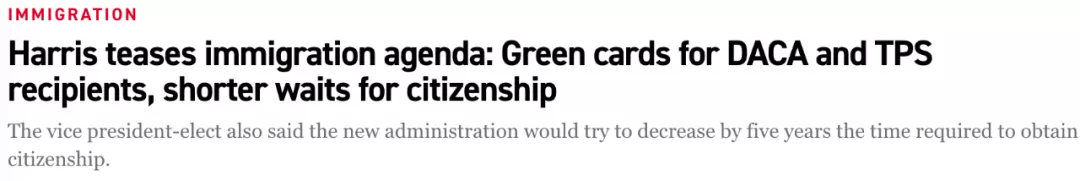 1月12日,美國當選副總統卡馬拉·哈里斯(賀錦麗)表示,拜登政府上任以后,將向“臨時保護身份”TPS和俗稱“夢想者計劃”的DACA持有者提供綠卡。同時,賀錦麗還表示,拜登政府還將結束特朗普政府的一些有爭議的移民政策。