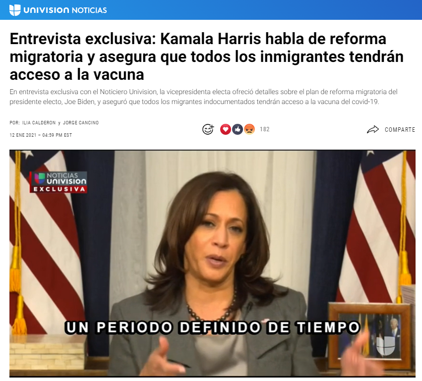 賀錦麗(Kamala Harris)在接受Univision News采訪時表示,拜登已經準備好了移民改革計劃,上任后將立即提交國會,目前國會參眾兩院都是民主黨占多數,因此他們計劃在拜登上任后100天通過此方案