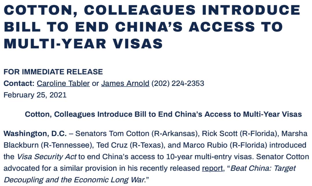 Cotton認為:自2014年以來,中國獲得了10年的商務和旅游簽證,允許中國公民隨意進出美國。在簽發這些簽證時,美國歡迎中國以及他們公開合作的機構。這在2014年是一個錯誤的決定,是時候糾正這個錯誤了。