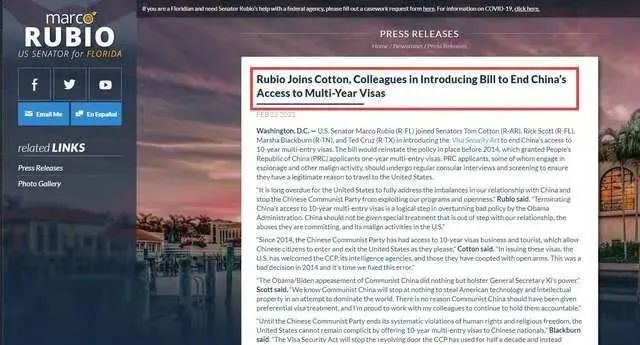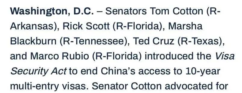 但最近,美國共和黨參議員Tom Cotton交了一份法案(Visa Security Act),他提議取消中美往返10年簽證,恢復2014年前的簽證狀態,允許1年多次往返中美。很明顯,他想要拿中美10年簽證開刀。