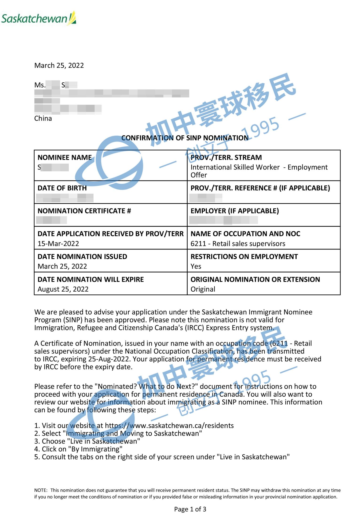 S女士工作經驗豐富,社保記錄文件完整,英語能力也不錯。簽約之后,我司很快為S女士匹配到與其工作經驗相符的零售主管職位。2022年1月,獲得JAL加名文件;2022年3月,我們文案團隊為S女士準備詳細全面的文件遞交省提名申請,僅十天S女士便收到省提名獲批信。