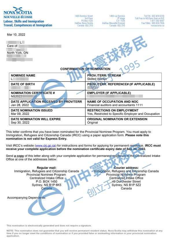 2022年3月10日,L女士,37歲周歲,財務會計,遞交省提名僅40天,NS省雇主擔保成功獲批。有關詳情如下: