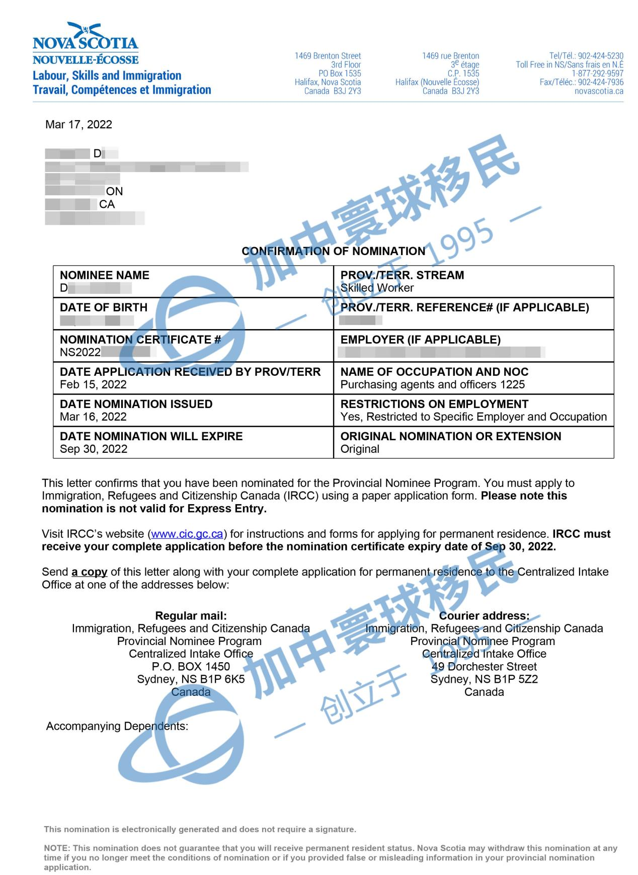 2022年3月17日,D女士,40周歲,采購(gòu)經(jīng)理,遞交省提名僅1個(gè)月,NS省雇主擔(dān)保成功獲批。有關(guān)詳情如下: