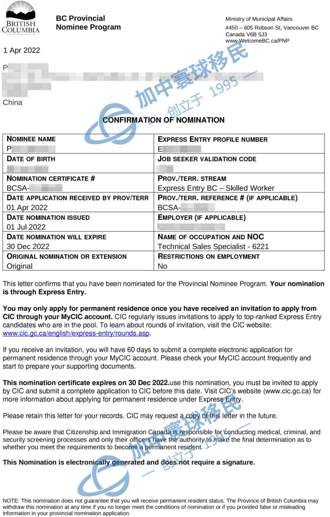 加中寰球客戶P女士(技術銷售專家)遞交加拿大BC省雇主擔保移民申請,省提名于2022年7月1日成功獲批,用時僅3個月。有關詳情如下: