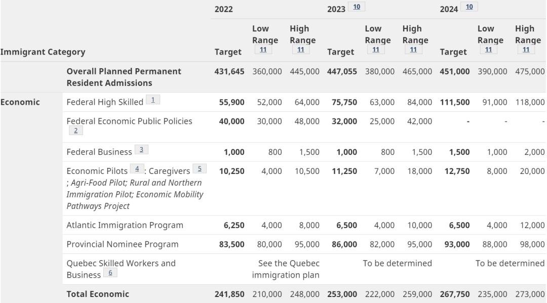 根據(jù)最新的加拿大2022-2024年移民水平計劃,未來三年,加拿大將接收超過130萬新移民,具體如下: