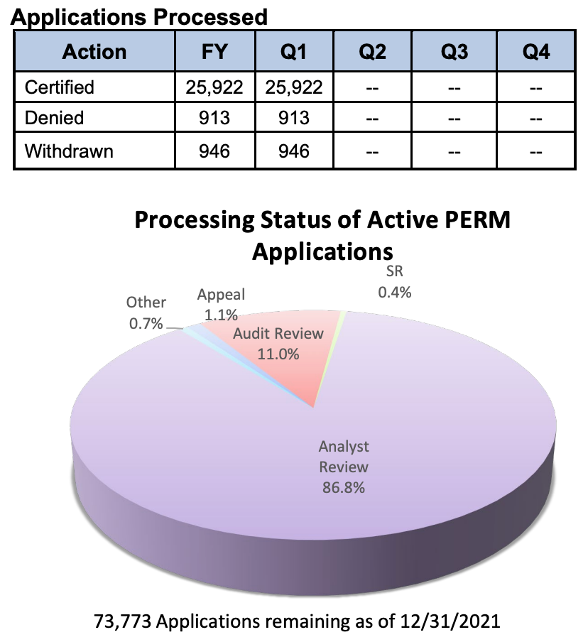 從數(shù)據(jù)中可以看到,PERM的批準(zhǔn)率平均在93%左右,拒批率僅為3%左右,當(dāng)前處理的申請(qǐng)中有11%會(huì)被抽查審計(jì)。
