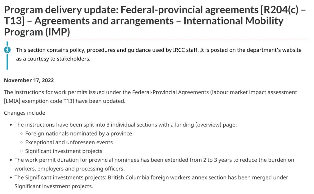 不僅如此,加拿大移民部近期還在其官方網站上發布了一則重要通知,針對已經獲得省提名證書的申請人在申請豁免LMIA的封閉工簽時將獲得更長的有效期,從原有的兩年時間增加至三年,這樣一來申請人就無需擔心在等待移民申請期間身份過期,可以繼續為雇主工作。