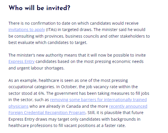 目前還沒有確認哪些候選人會在有針對性的抽簽中收到申請邀請 (ITA)。移民部長弗雷澤表示,他將與各省、商業委員會和其他相關者進行磋商,以最好地評估目標候選人。