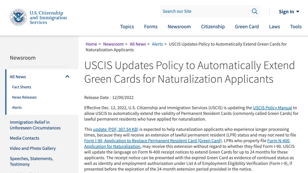 自2022年12月12日起開始,美國移民局將為已提交美國公民申請的符合條件的綠卡持有人自動延長24個月綠卡使用期限。