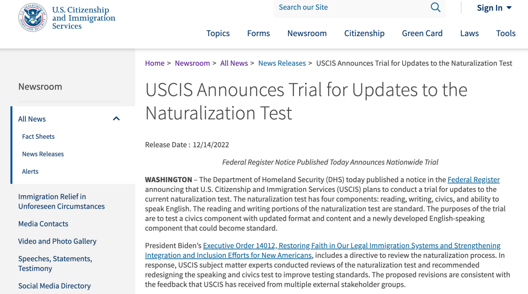 移民局局長賈杜(Ur M. Jaddou)表示,“入籍考試是成為美國公民的關鍵一步。我們歡迎熟悉這一重要過程的利益相關者的意見和參與與此同時我們將繼續改進和更新我們的入籍測試確保它與行業測試標準一致。”