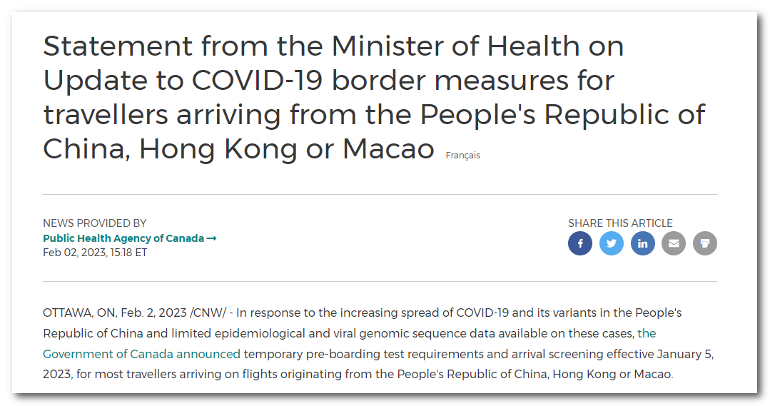 加拿大聯(lián)邦政府于去年12月31日宣布,要求來自中國(guó)大陸、香港和澳門的航空旅客,入境前進(jìn)行新冠病毒檢測(cè)。該要求于1月5日生效,原本實(shí)施30天,即將到期。加拿大衛(wèi)生部發(fā)布聲明,將于2023年2月4日,東部時(shí)間凌晨12點(diǎn)01分起延長(zhǎng)從中國(guó)大陸、香港和澳門乘飛機(jī)抵達(dá)旅客的入境檢測(cè)要求。