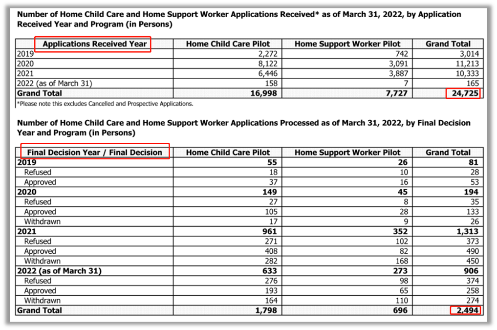 從2019年1月到2022年3月,IRCC在其保姆/家庭護工移民試點項目下收到了24,725份申請,其中: