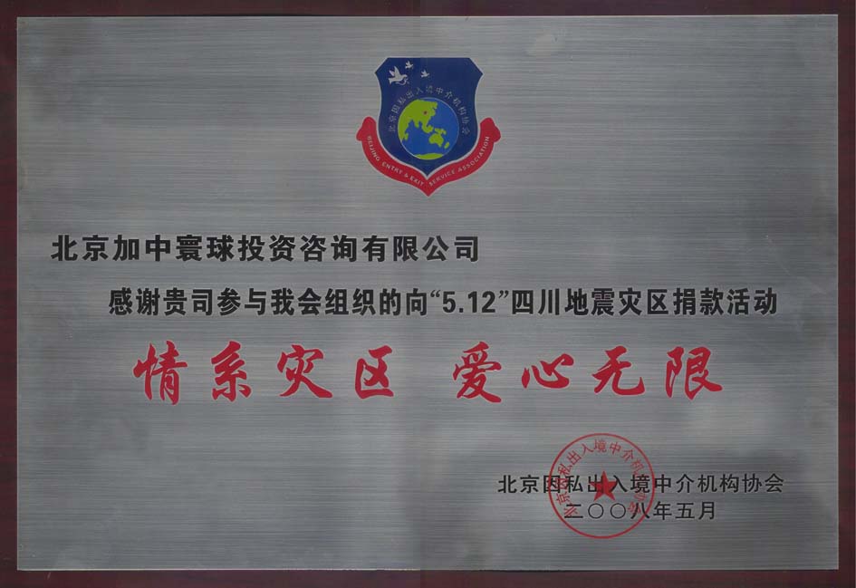 加中寰球情系災(zāi)區(qū),積極開展抗震救災(zāi)行動,攜手Crystec捐助300萬元,并組建援助隊伍,奔赴災(zāi)區(qū)工作。北京市出入境管理局及北京市出入境中介協(xié)會對我公司在四川汶川大地震中踴躍捐款一事提出表揚,同時頒發(fā)了榮譽證書。金色的牌匾不僅是榮譽的象征,更是樂善好施的見證,一方有難八方支援,加中寰球為災(zāi)區(qū)人民送去濃濃的同胞親情。