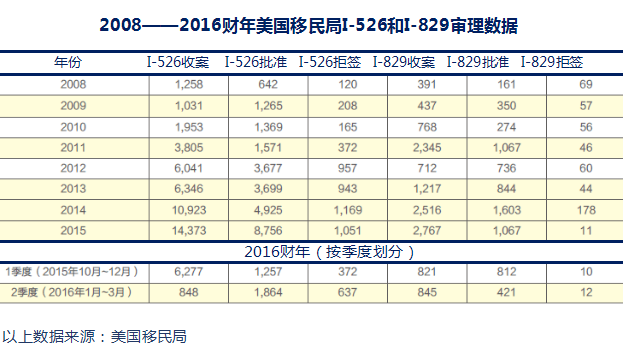 繼2015財年第四季度I-526收件數達到創紀錄的6,575件、2016財年第一季度I-526收件數繼續沖高至6,277件——連續創造兩個歷史高峰之后,2016財年第二季度的I-526收件數直線下降到848件,是近幾個財年季度的最低收件量。