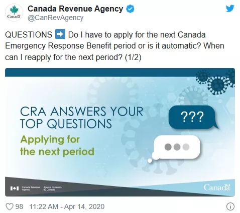4月14日,加拿大稅務局(CRA)在Twitter上回答了有關這項最新補助的相關問題。最重要的一件事是這筆補助,在整個四個月的時間內是否自動更新。