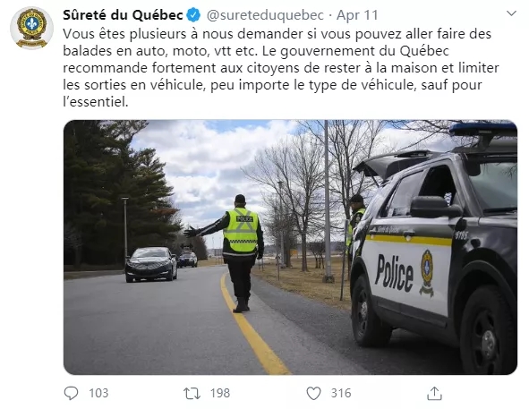 在剛剛過去的周末,魁省警察到推特上告訴居民,根據當地的社會距離規定,禁止兜風!