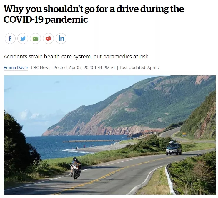 盡管加拿大政府目前沒有特別強調駕駛出行的問題,但他們的首要信息一直是呆在室內,如非重要事項要避免出門。
