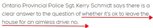 另外,安省警長Kerry Schmidt表示,對于是否可以在戶外漫無目的地駕駛,答案很明確:不行!
