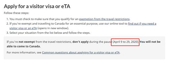 加拿大聯邦移民局(IRCC)發布 最新消息:2020年4月9日至2020年4月29日,除了旅行限制豁免人士可以申請旅游簽證或電子旅行授權(eTA),非豁免人士均不能在此期間申請旅游簽或eTA。