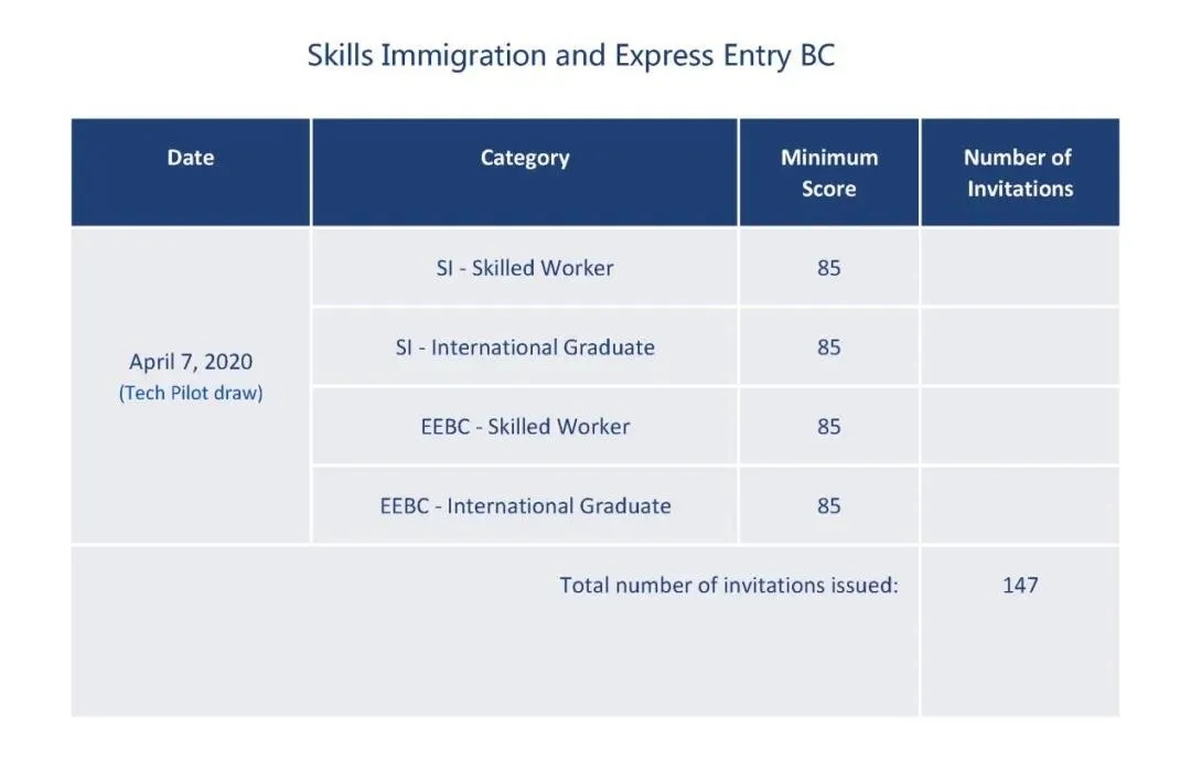 除了聯邦EE篩選分數大幅降低之外,BC省高科技類雇主擔保技術移民抽選分數一直維持在90-95分,而在4月7日的最新一輪篩選中也下降到85分!
