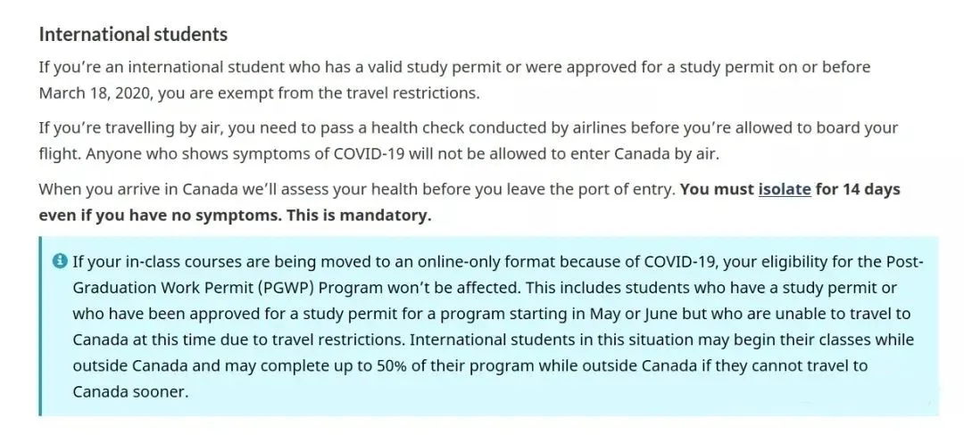 2020年4月7日,加拿大移民局再次更新了一條關于留學生的新規:針對已持有學簽和學簽剛獲批的學生,如果您是今年5~6月份開學的,近期受旅行條例限制無法入境加拿大,可以留在自己國家上網課。此類情況不影響今后申請畢業后工簽的資格。在加拿大境外期間網課至多可以完成整個課程的50%。