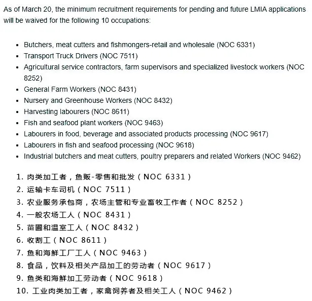 2020年4月8日,加拿大公布了最新的對于海外勞動雇傭的利好政策,針對10個行業跳過了工作許可流程中最耗時的環節,免除了10個高度優先職業LMIA廣告要求。免除期到2020年10月31日。這是繼疫情起減免2周廣告期后更大力度的舉動。