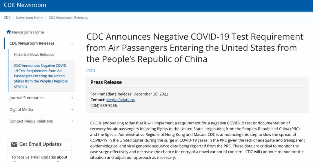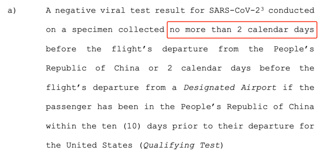 美國(guó)疾控與預(yù)防中心(CDC)于12月28日發(fā)表最新聲明稱,自美東時(shí)間1月5日凌晨12點(diǎn)01分起,從中國(guó)大陸、香港及澳門(mén)出發(fā)前往美國(guó)的兩歲及以上乘客,需在航班起飛前的2個(gè)日歷日內(nèi)進(jìn)行新冠病毒檢測(cè),并在登機(jī)前向航空公司出示“陰性檢測(cè)證明”。新冠測(cè)試的方式可以是核酸檢測(cè),也可以是抗原測(cè)試。