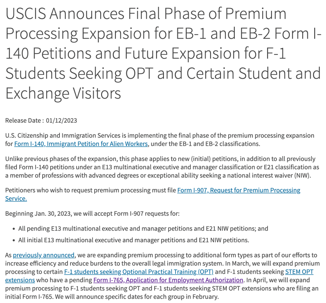 ·從2023年1月30日起,移民局開始接受所有無論何時提交的、正在pending待審理的EB-1C和NIW的I-140申請的加急申請;