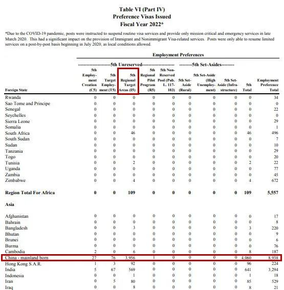 值得注意的是,在EB-5的表格中還體現出了簽證預留類別,報告顯示,2022財年預留簽證一張未用。