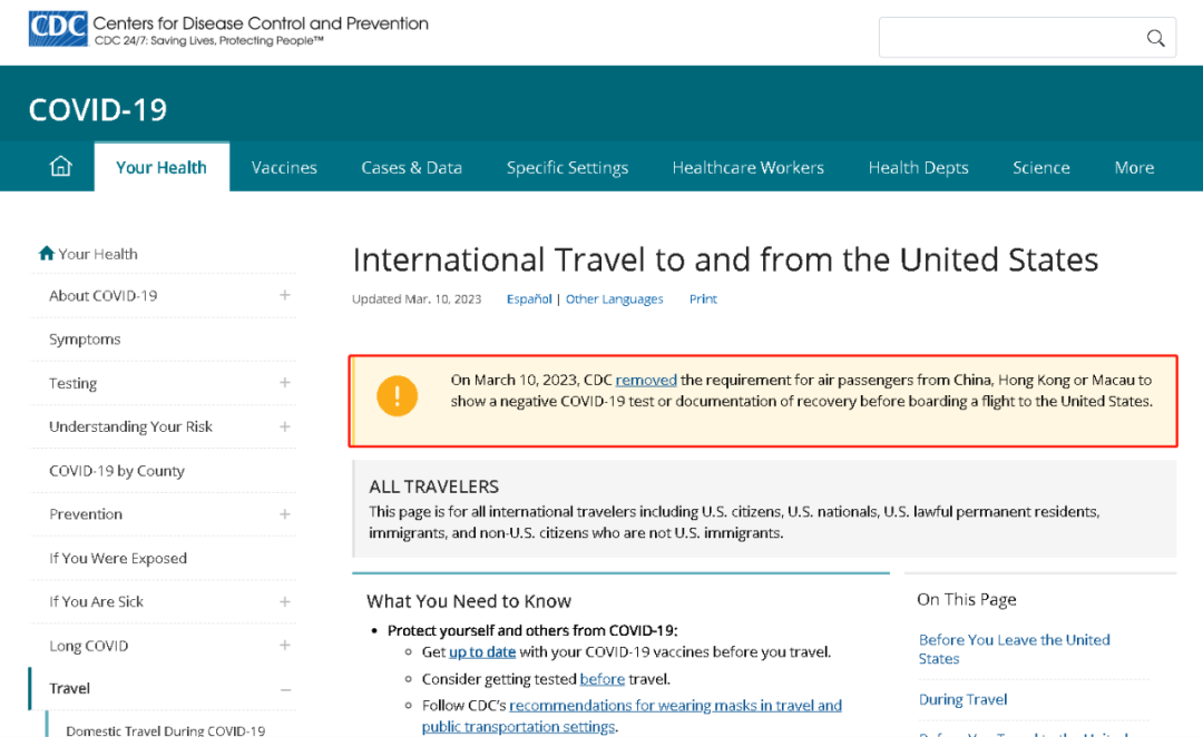 根據(jù)美國(guó)疾病控制與預(yù)防中心(CDC)發(fā)布的最新通告(更新于2023年3月10日),自美東時(shí)間2023年3月10日下午3:00(北京時(shí)間3月11日凌晨4:00)開(kāi)始,所有從中國(guó)(包括香港和澳門(mén))出發(fā)前往美國(guó)的兩歲及以上旅客無(wú)需在飛行前接受新冠病毒檢測(cè)提供陰性檢測(cè)證明或者提供新冠康復(fù)證明。